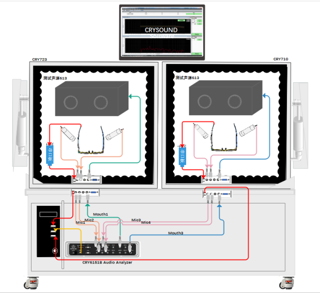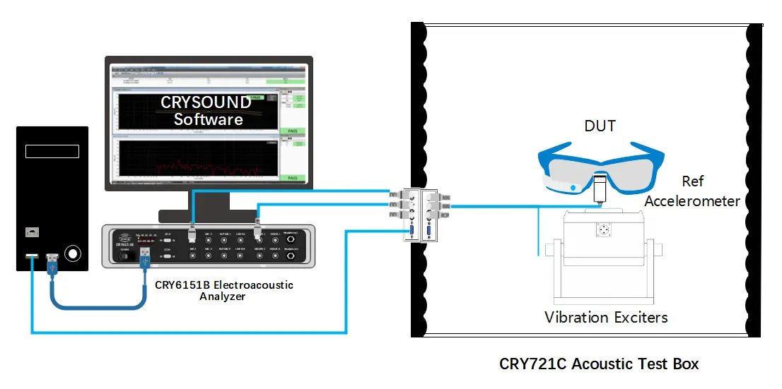 CRYSOUND’s AR glasses VPU production-line testing solution uses the CRY6151B Electro-Acoustic Analyzer as the testing and analysis platform. The vibration table provides stable excitation, and the product VPU synchronizes vibration response signals with a reference accelerometer. Software analysis evaluates key parameters such as frequency response (FR) and total harmonic distortion (THD).This test architecture balances testing effectiveness and production-line throughput, meeting the deployment needs for VPU testing at different stations.