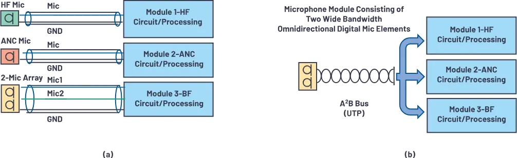 (b) Digital system design with digital mic elements (A²B technology and UTP wires).