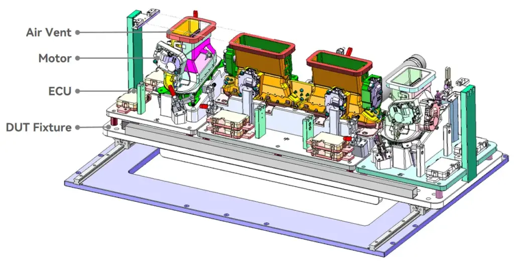 - One fixture, three test positions: supports parallel or mixed testing of left/center/right dashboard air vents, improving efficiency by >100%.