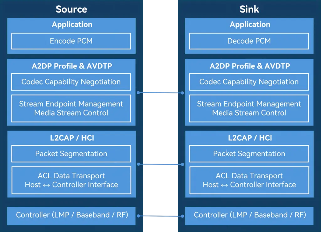 Below this is the A2DP Profile layer, which functions as a “cooperation agreement”. It defines which device acts as the Source and which as the Sink, along with the supported codecs, sampling rates, and other parameters. The profile itself does not carry audio data; instead, it ensures both sides agree on “what format to use and how to transmit” before streaming begins.