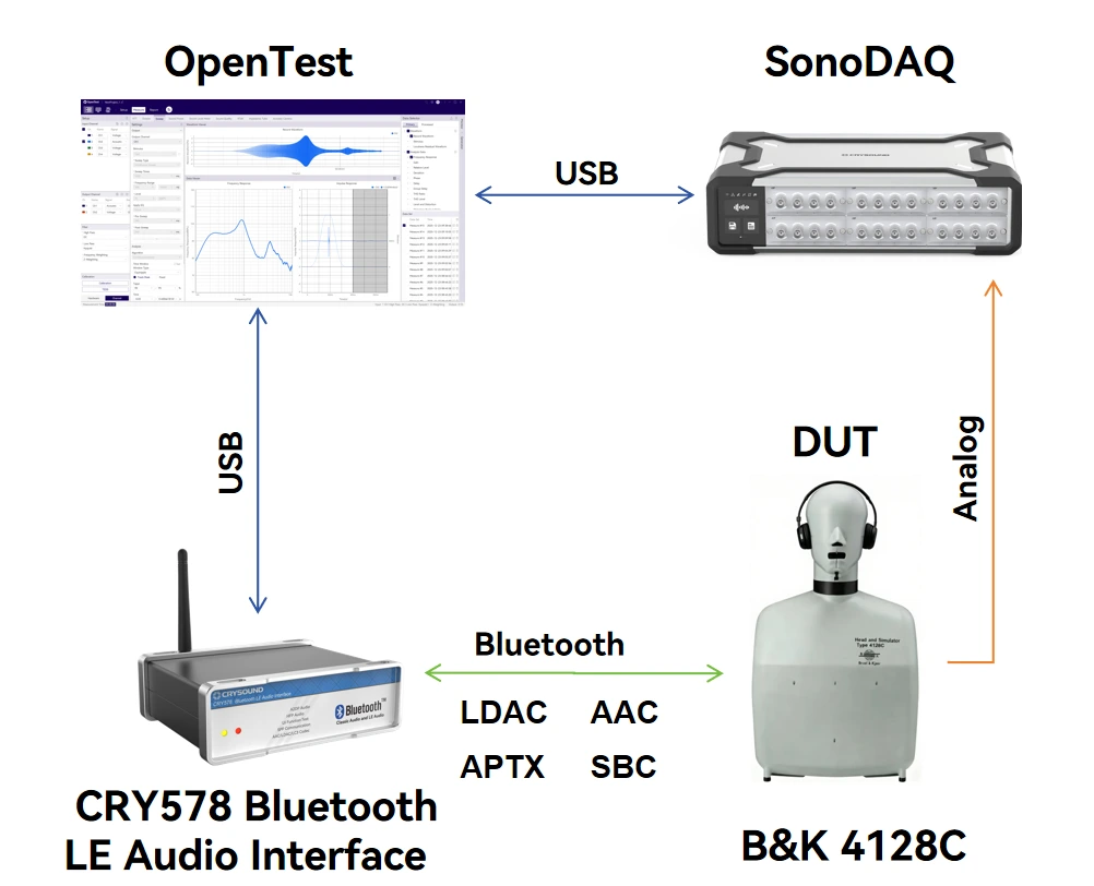 In this setup, the CRY578 can be controlled either via its PC software (Bluetooth LE Audio Interface) or through serial commands to scan for nearby Bluetooth devices and establish connections. Standard test signals—such as sweeps, noise, and distortion signals—are played from the PC. The acoustic output from the DUT is captured and analyzed by OpenTest to evaluate performance metrics such as frequency response, distortion, and signal-to-noise ratio. The CRY578 also supports switching to high-quality codecs such as AAC and LDAC, as well as multiple sampling rates, for comprehensive testing.
