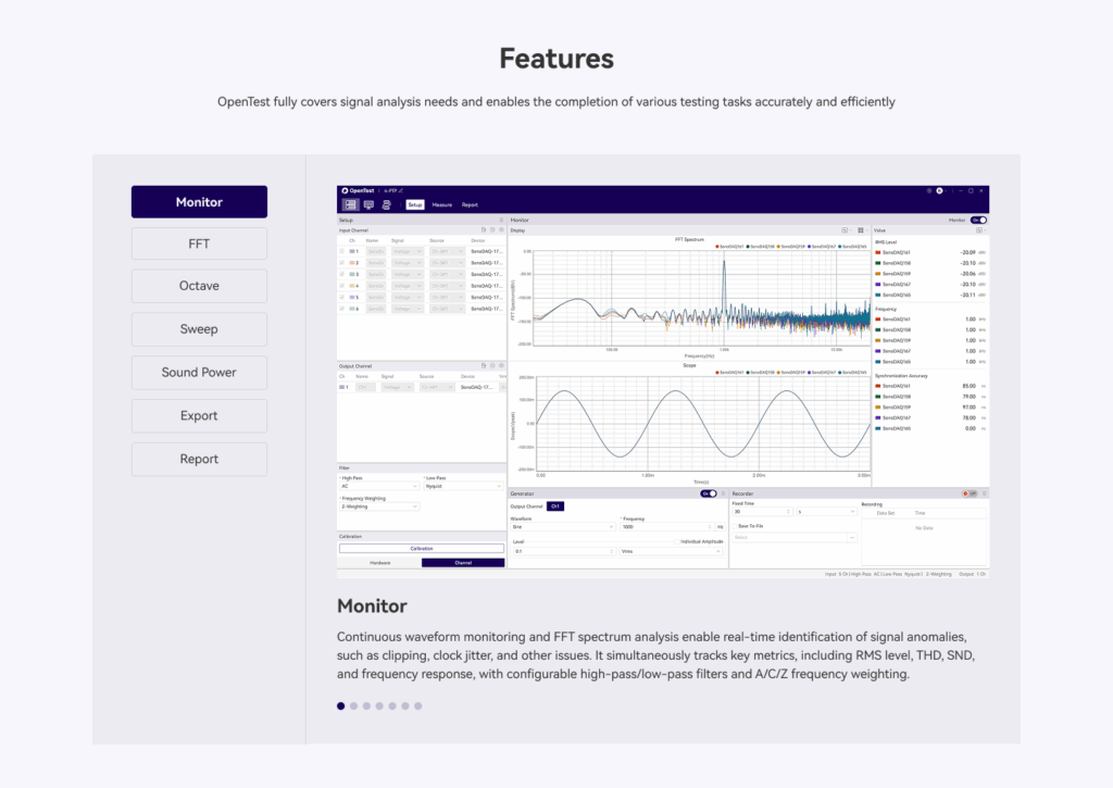 Monitor, FFT, Octave, Sweep, Sound Power, Export, and Report—covering mainstream acoustic and vibration analysis in lab or line environments.