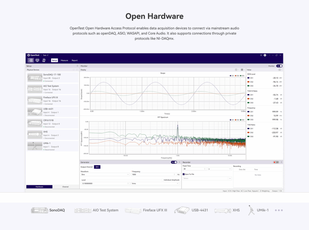 • Open ecosystem for hardware and plugins, supporting mainstream audio/DAQ interfaces and multiple development languages.