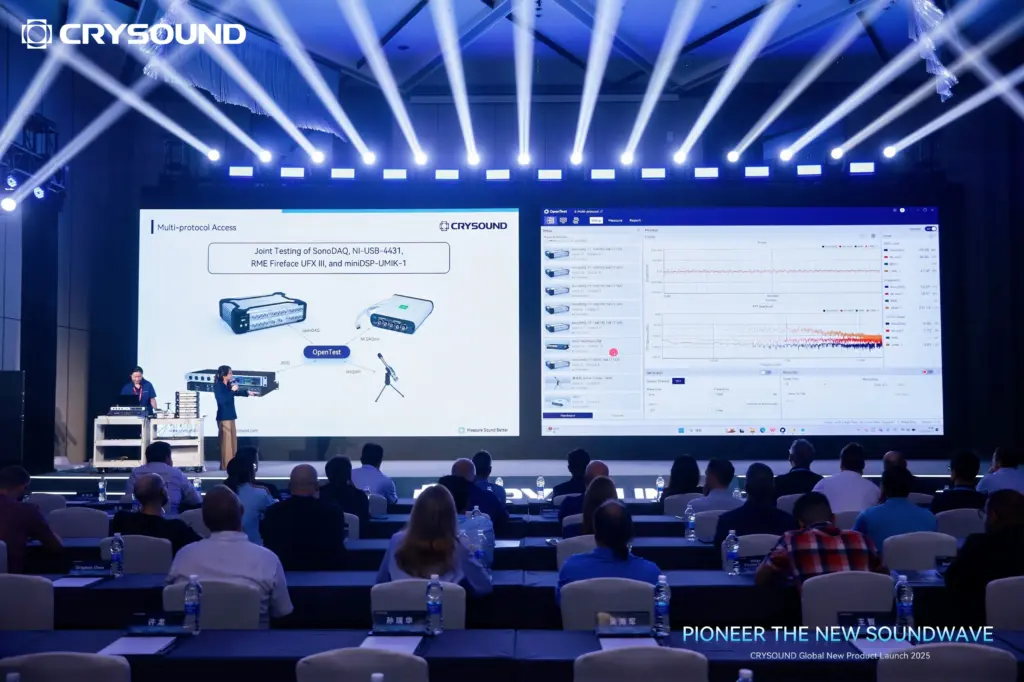 On October 16–17, 2025, the CRYSOUND Global New Product Launch 2025 successfully took place in Hangzhou. The conference showcased the company’s latest innovations across multiple key areas, such as data acquisition, acoustic imaging, sound calibration, and Bluetooth audio. Newly launched products include SonoDAQ, OpenTest, the CRY8500 Series SonoCam Pi Acoustic Camera, the CRY3010 Series Sound Calibrator, and the CRY578 Bluetooth LE Audio Interface. During the conference, customers, partners, and industry experts from more than twenty countries gathered to explore cutting-edge innovations and future applications in acoustic technology.