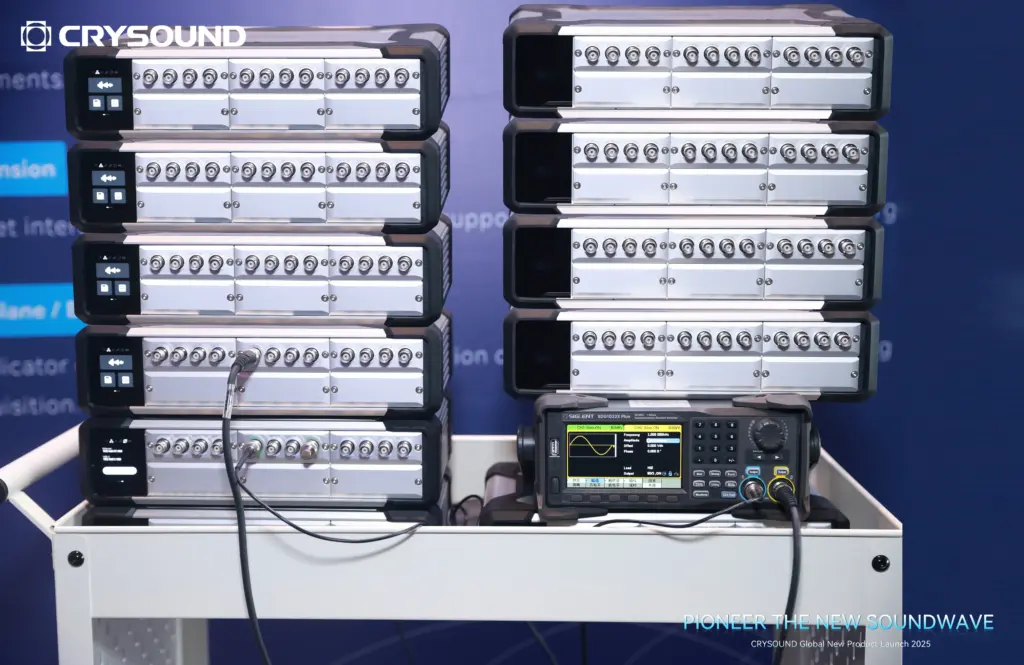 Next to the main venue, CRYSOUND set up ten booths to highlight both its latest innovations and classic products. The live demonstration of ten networked SonoDAQ units became a key attraction, featuring PTP precision synchronization with under 100 ns inter-device latency, modular expansion, and intelligent LED backplane indicators, fully showcasing the system’s high-precision distributed acquisition capabilities.