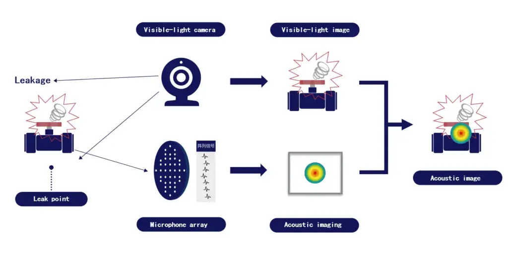 Basic principle: pressurized gas leak → ultrasonic signal → colorful soundmap on the image