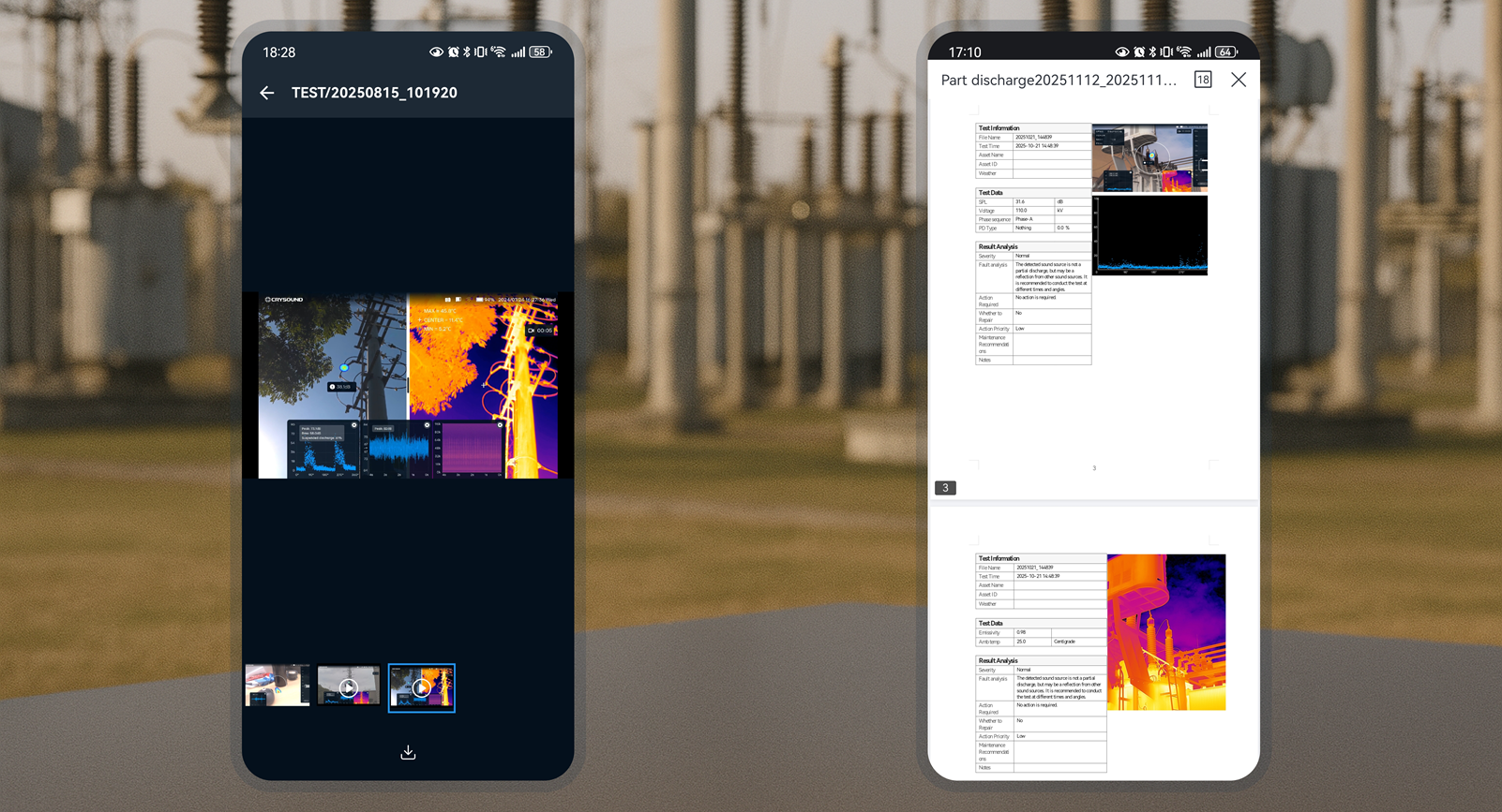 Review high-resolution photos and videos captured by the Acoustic Imaging Camera directly on your mobile device. Key report metrics are available at a glance. Zoom, frame-by-frame scrubbing, and sequential browsing help compare operating conditions, identify anomalies, and produce standardized records.