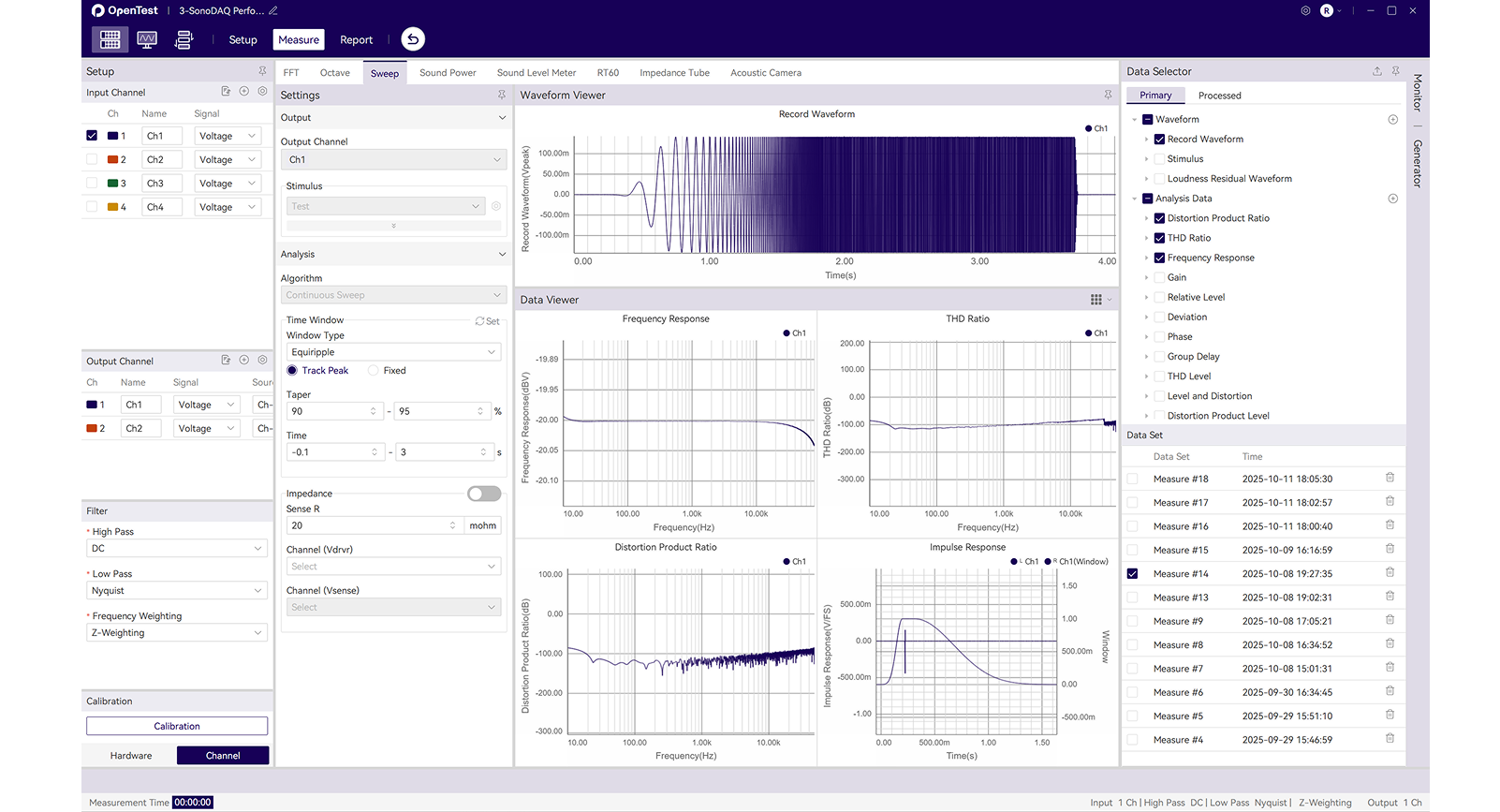 This function utilizes logarithmically varying sweep signals to extend energy accumulation time in low-frequency ranges, ensuring measurement accuracy. At the same time, it significantly improves test efficiency. It enables fast and reliable testing for applications such as resonance peak detection in speakers, phase continuity analysis in headphones, and frequency response flatness evaluation in amplifiers. Results automatically comply with industry standards and generate professional test reports. It is an indispensable tool for audio R&D, production, and quality control.