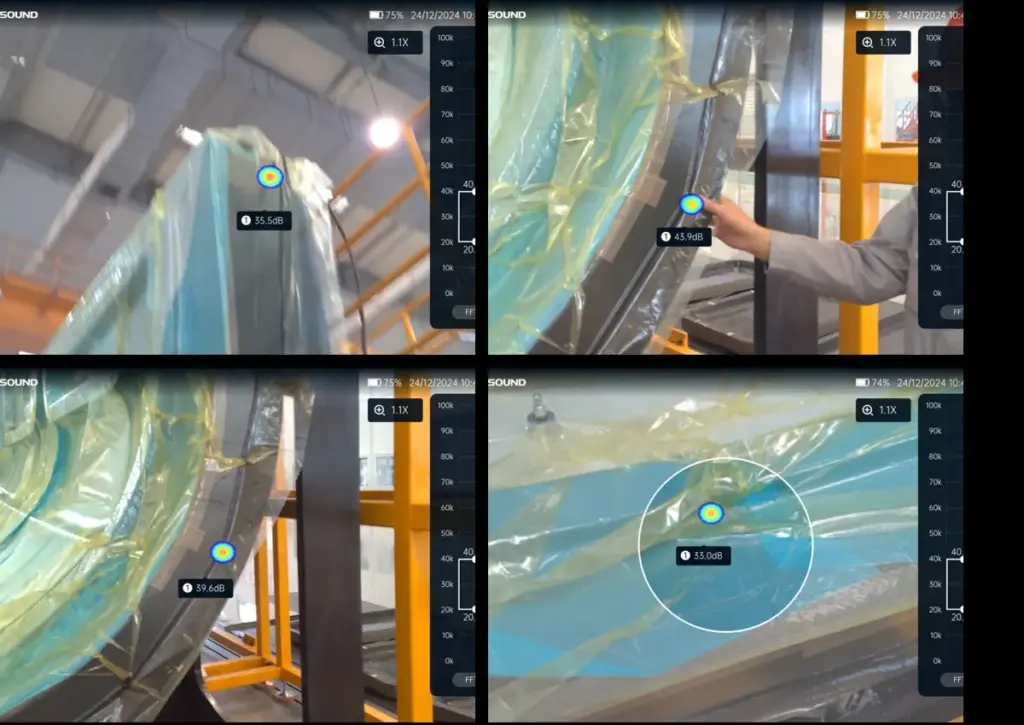 In this project, CRY8124 Acoustic Imaging Camera was used to perform scan-based inspections across key areas of the shell. The core value of acoustic imaging lies in making the sound source generated by a leak visible on the screen—turning leak localization from “guessing” into “seeing.”