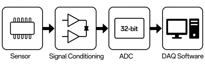 Put simply, a data acquisition system (DAQ) is an analog front end that converts a sensor’s analog output (voltage/current/charge, etc.) into digital data at a defined sampling rate and resolution, and hands it to software for display, logging, and analysis (typically with the required signal conditioning). It helps engineers see problems more clearly—and solve them.